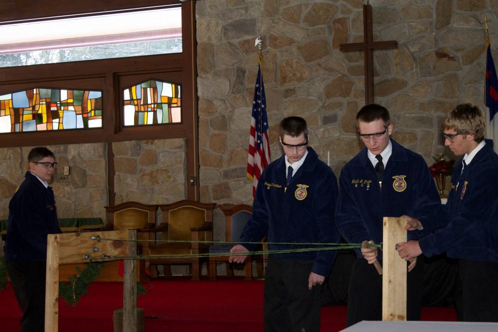 The Laurel High School FFA members gave a presentation on how to devise a mechanical device to twist six pieces of baler twine together, which is then used to create a halter for a cow. They are also scheduled to compete at the Pennsylvania Farm Show.
