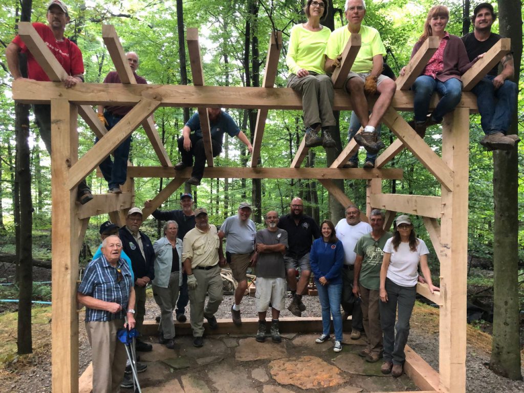 Shortly after the barn fire of ’93, the Ohio Department of Natural Resources decided to build an historically accurate structure to replace the barn using a timber frame. The ODNR contacted Rudy Christian, founding member of the Timber Framers Guild of North America, who put a call out to the guild for workers to help with the barn raising.