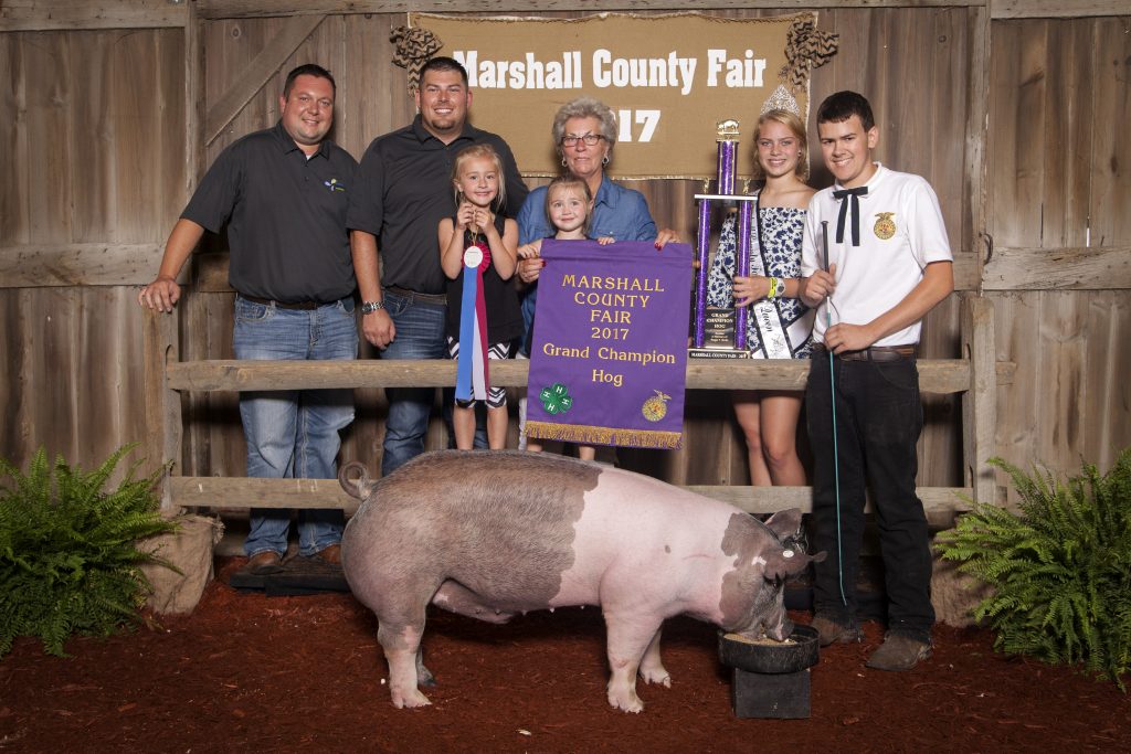 Wade Lucey showed the 280-pound grand champion hog. Young’s Cattle Company, represented by Rick and Jayne Young, and American Petroleum Partners, represented by Dustin Emenhiser, purchased the hog for $28 per pound. (Submitted photo)