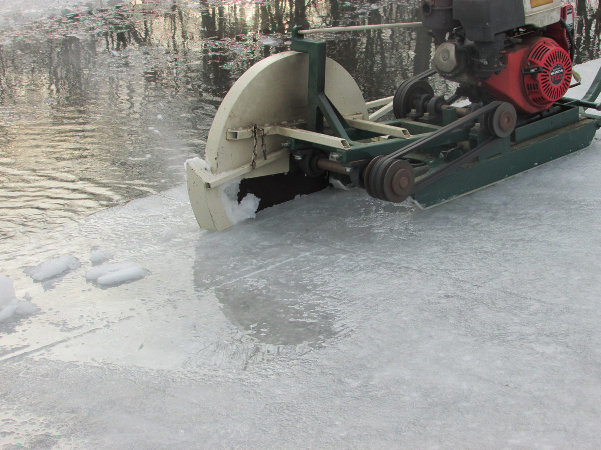 The first order of business was to mark the area of ice to be cut with parallel lines about 16 inches apart with a circular saw on a sled.