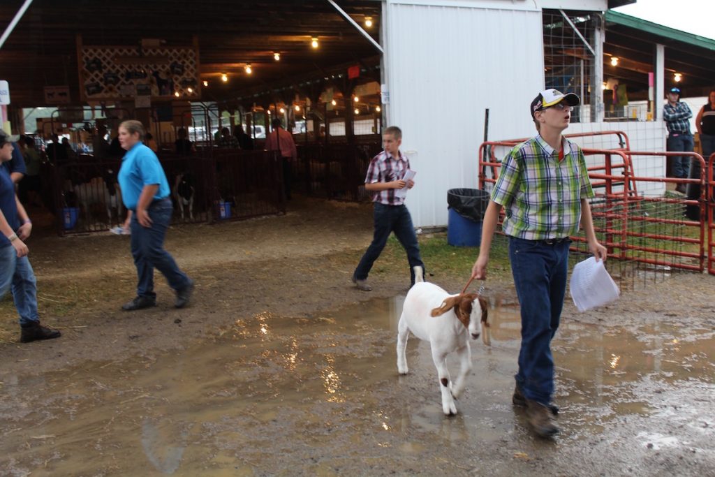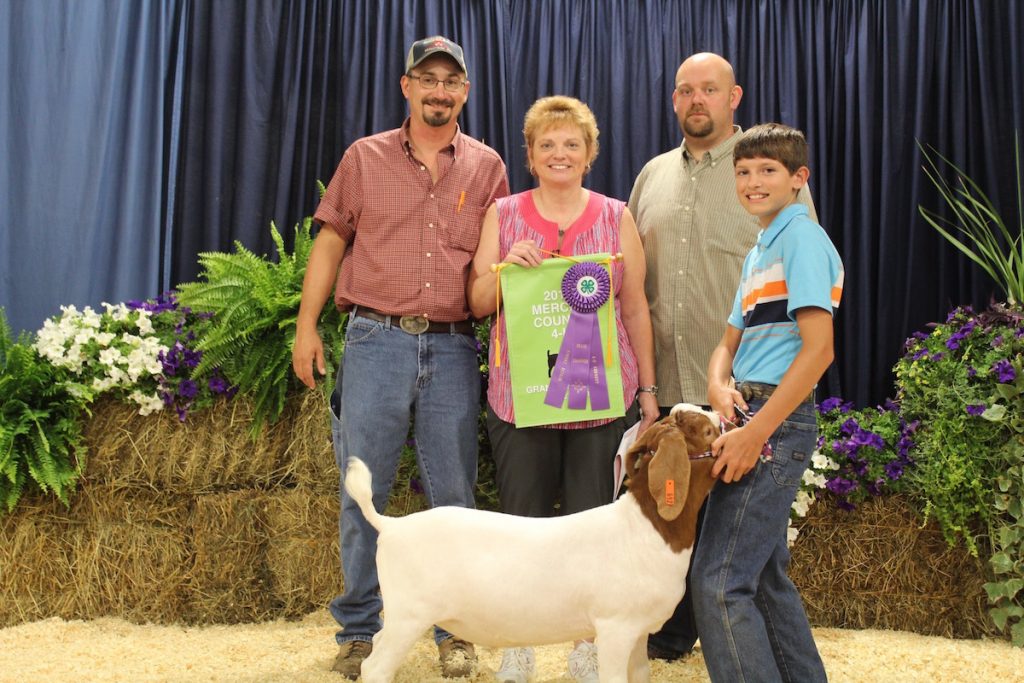 Woodrow Nickel sold his 91-pound grand champion market goat for $10 a pound to Eric Watson (left), of Watson’s Inc., Beth Hillmar, of New Wilmington Sales Co., and Mike Uber, for New Wilmington Veterinary Service.