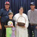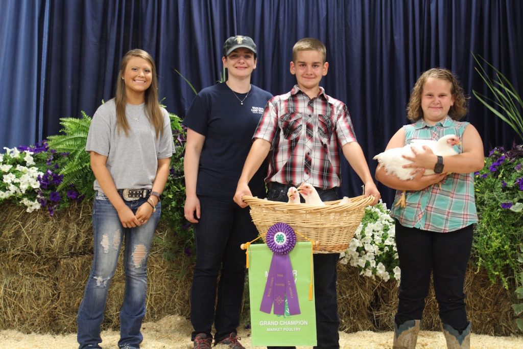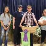 Addison Olson (right) sold her 23-pound grand champion market poultry for $30 a pound to Brina Wagler of Wagler’s Camp Perry, with Alexis Riley (left) and Deven Olson holding the basket.