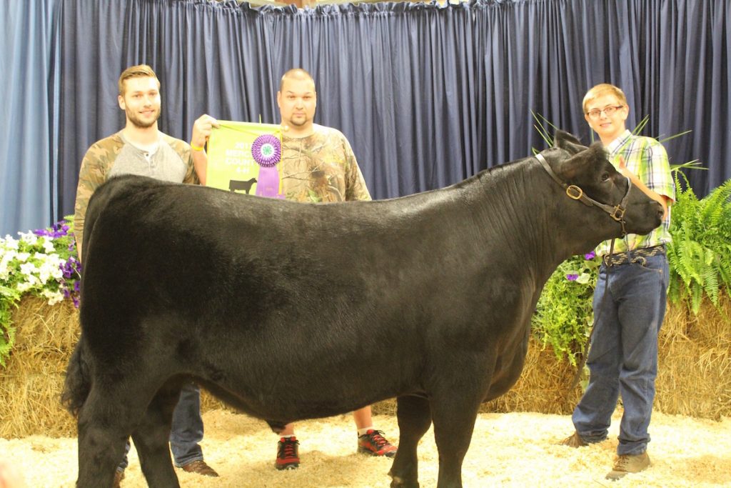 Chance Rains sold his 1,376-pound champion market steer for $4.10 a pound to Michael (left) and Hans Koller, for Fairview Swiss Cheese.