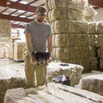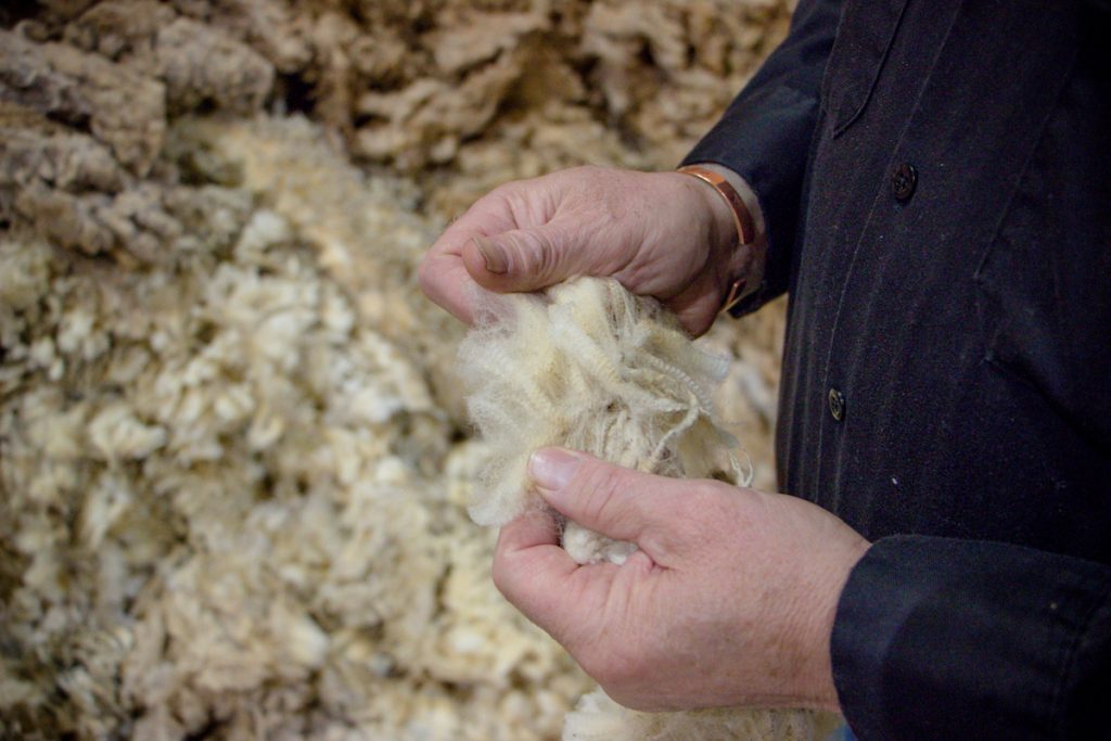 When the wool arrives at the warehouse, it is sorted, bagged and given a lot number. When it’s time to grade, the wool is put on a conveyor belt that takes the wool up to a platform where Drew Cable is waiting to grade the wool by hand.