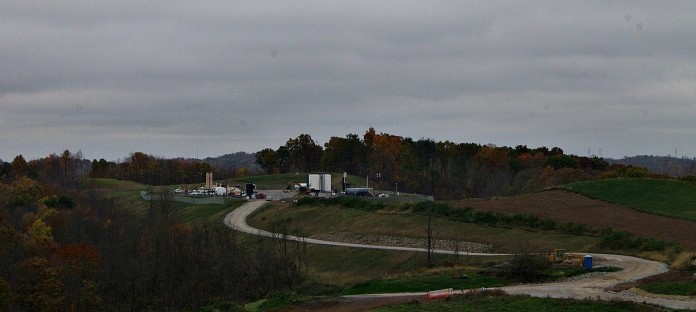The Mizers’ farms are in Harrison County, in the middle of Utica shale country. In each direction around the farm is shale activity. To the north, a visitor can see a well being drilled; the side of the roadway is lined with trucks awaiting delivery of fracking equipment; and up on a nearby hill is a facility for separating gases, oil and water.