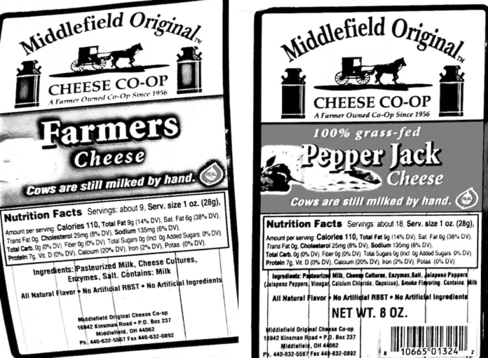 Middlefield is recalling nearly 250 pounds of pepperjack cheese, 2.5 pounds of horseradish-flavored cheese, 640 pounds of Monterery jack cheese and 4,544 pounds of white cheddar. The recalled products were produced on June 16,  June 24 and July 16 and distributed in the state of Ohio between July 14 and Aug. 7. Products were shipped to manufacturers and distributors and sold in retail stores.