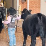 A beef expo exhibitor takes a moment to make sure her steer is set during the Junior Market Show at the Ohio Beef Expo March 18.