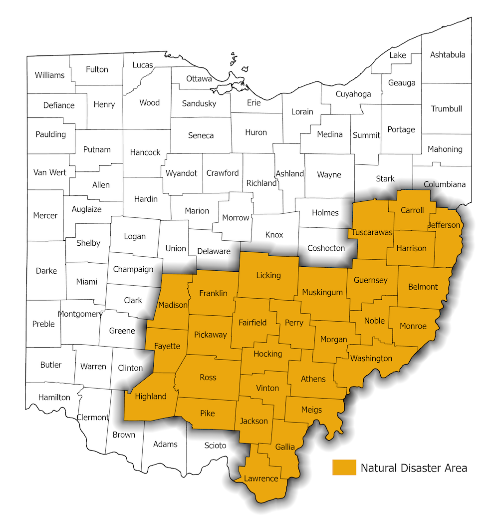 The 28 counties include Athens, Belmont, Carroll, Fairfield, Fayette, Franklin, Gallia, Guernsey, Harrison, Highland, Hocking, Jackson, Jefferson, Lawrence, Licking, Madison, Meigs, Monroe, Morgan, Muskingum, Noble, Perry, Pickaway, Pike, Ross, Tuscarawas, Vinton and Washington.