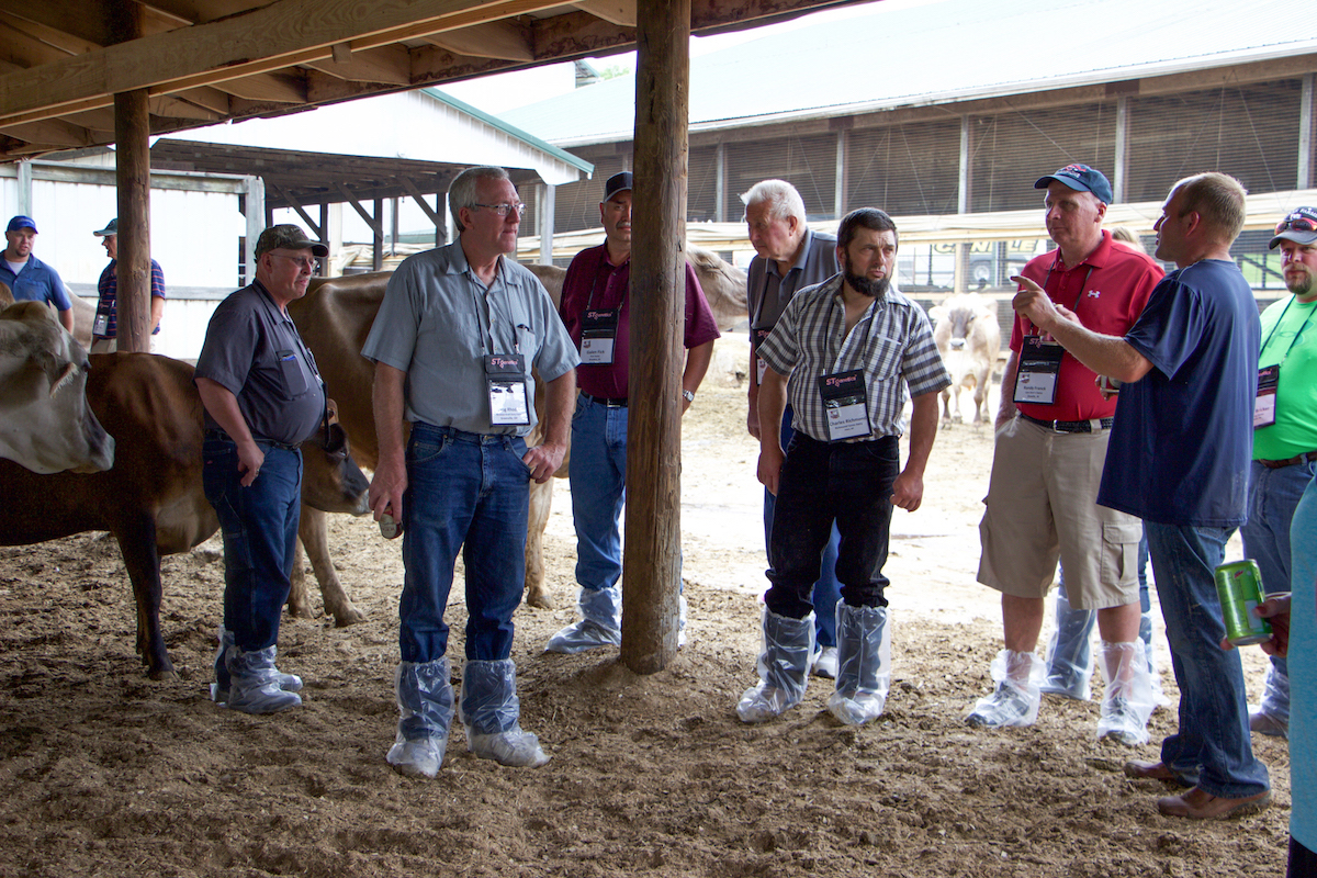 Kevin Michalovich talks with farmers from across the nation about his herd of Brown Swiss cattle during a tour of his family’s farm, RNR Swiss, in Lakeville, Ohio. RNR Swiss was a part of the National Brown Swiss Convention tour July 6.