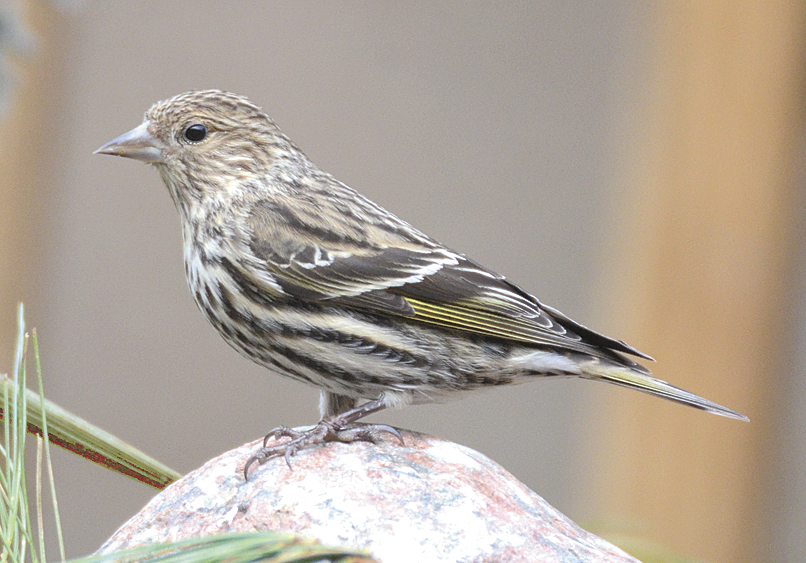 Siskins are about the same size and shape as goldfinches, but are much browner and heavily striped with blurry brown streaks. Tinges of gold in the wings and tail are distinctive.