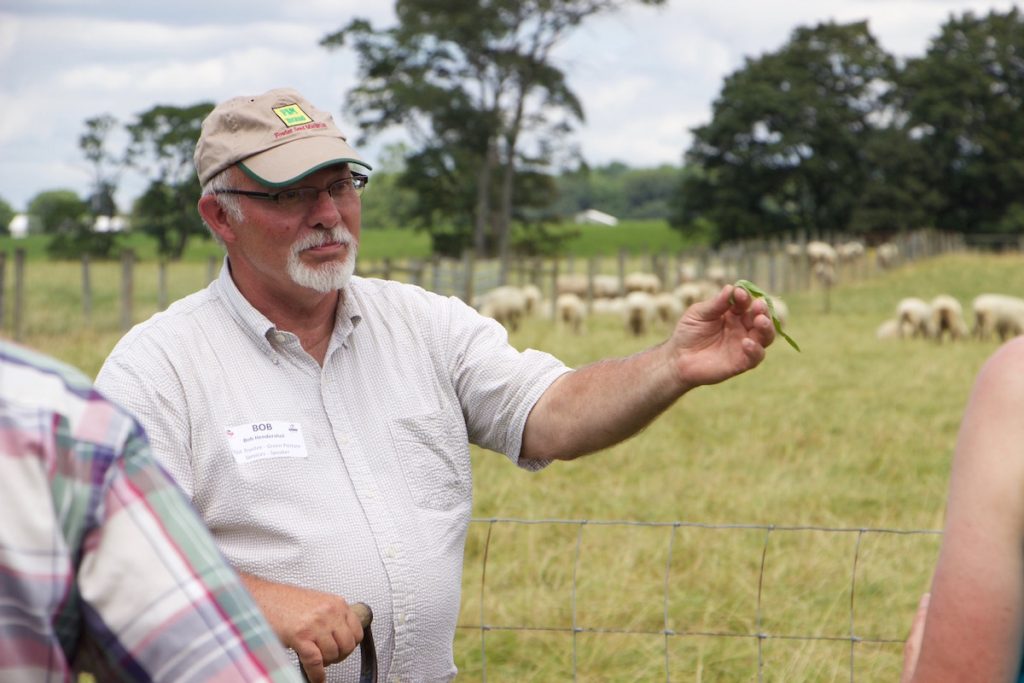 Bob Hendershot, vice-chair of Green Pasture Services and Ohio Sheep Improvement Association board member, talks with sheep producers about forage quality and pasture management during a pasture walk of the OARDC sheep research facility in Wooster, July 15, part of Ohio Sheep Day.