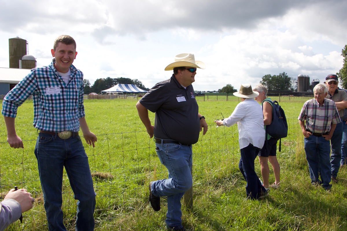Brady Campbell and Jeff McCutcheon talk about research on sheep weaning and parasite management during Ohio Sheep Day, July 15.