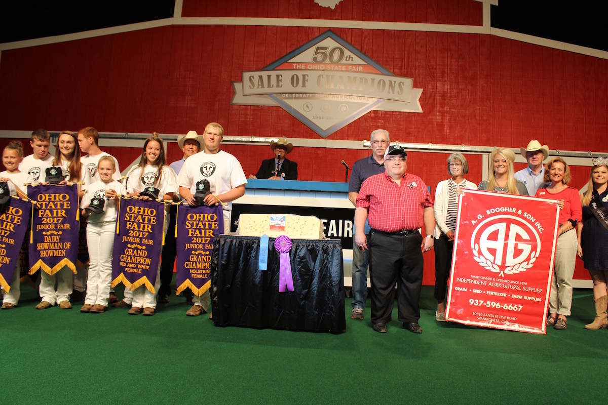 The grand champion Swiss Cheese, from Pearl Valley Cheese Co., was bought for $22,000 by AG Boogher and Sons, S & S Volvo and GMC Trucks. The exhibitor cap was $3,000. The champion Ayrshire was represented by Lane Greiwe, Shelby County; champion Brown Swiss, Keaton Topp, Shelby County; champion Guernsey, Aubree Topp, Shelby County; champion Holstein, Kris Ackley, Logan County; champion Jersey, Allison Francis, Darke County; champion Milking Shorthorn, Somer Reid, Guernsey County; and champion Red and White, Ally Cupps, Champaign County.