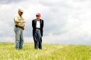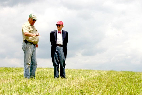 Carroll County cattleman and grazier Earl McKarns, left, hosted Ohio State University President E. Gordon Gee on Shamrock Vale Farm June 19. Gee visited the farm as part of his whirlwind statewide tour and to recognize McKarns as an Ohio Professional Beef Producer. A plaque for the award was presented on behalf of the Ohio Cattlemen’s Association and Ohio State University Extension. While visiting the farm, Gee learned about beef cattle production and the farm’s rotational grazing program from McKarns and his son, Dan.