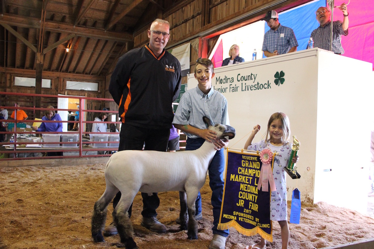 The Medina County Fair reserve champion market lamb, weighing 134 pounds, was shown by Clayton Sparks and purchased by Ryan Gregoire of Ag Design for $15.50 a pound. Also pictured Tessa Sparks.