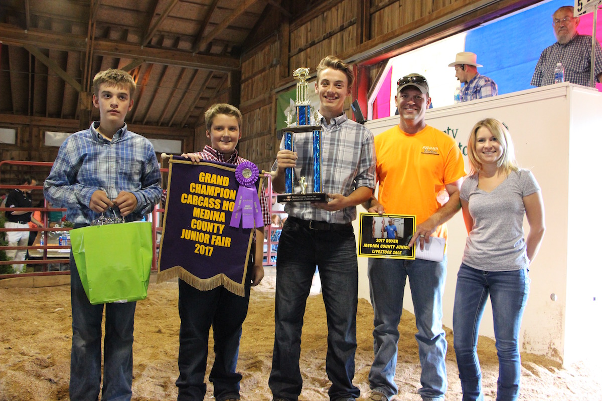 The Medina County Fair grand champion carcass hog, weighing 143 pounds, was shown by Zander Throckmorton and purchased by Jason and Jessica Sulzener of Precision Outdoor Creations for $6 a pound. Also pictured Griffin and Elliot Throckmorton.