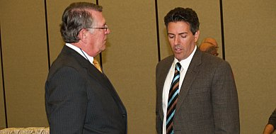 Ohio Agriculture Director Robert Boggs (left) converses with HSUS CEO Wayne Pacelle at the livestock care board meeting Jan. 4