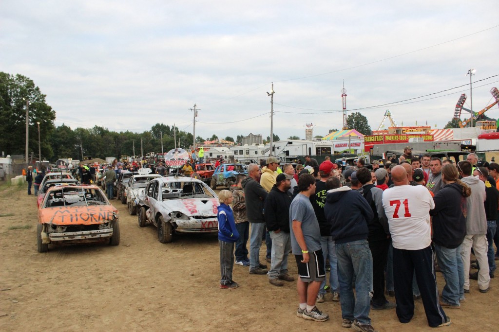 Cars are lined up for the demolition derby at the Portage County Fair Aug. 26.