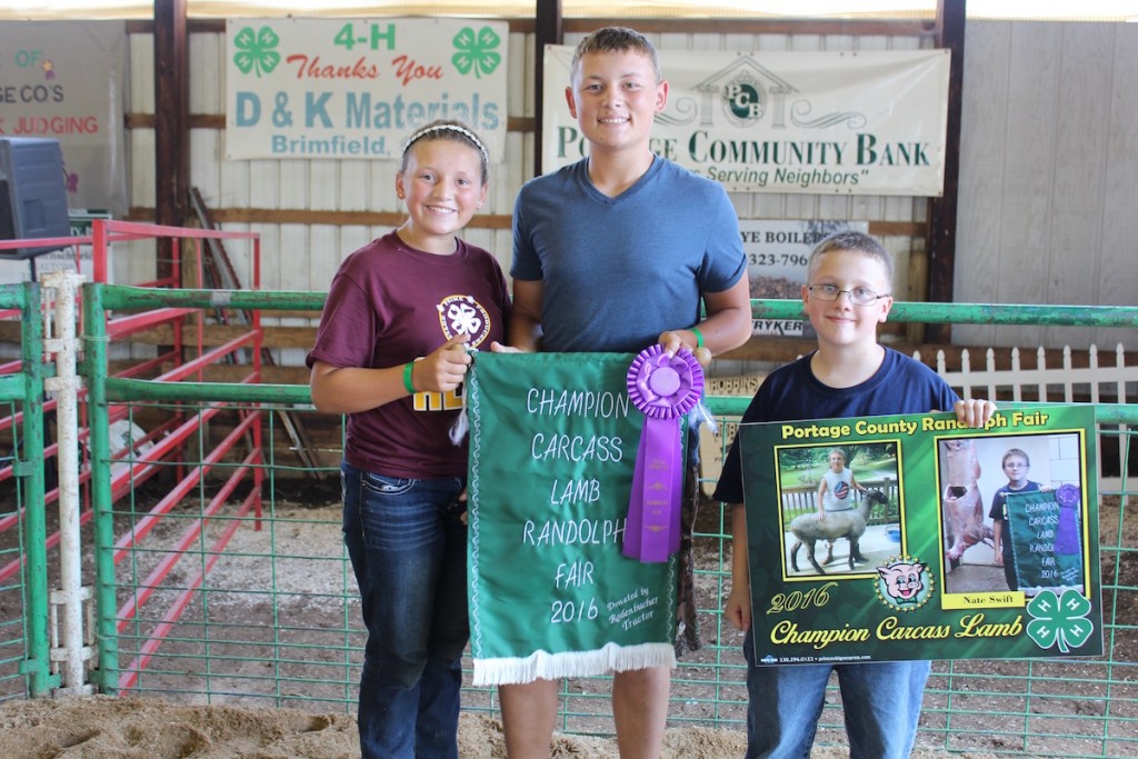 Nathan Swift sold his 48-pound champion carcass lamb for $12 a pound to Mackenzie and Cameron Langford, the buyers of the grand and reserve champion hogs.