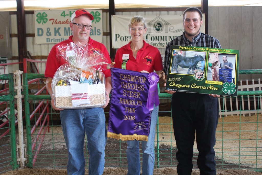 Brandon Loebick sold his 822-pound champion carcass steer for $6 a pound, to Polen Meats and Kiko Meats, represented by Brad and Nancy Polen.