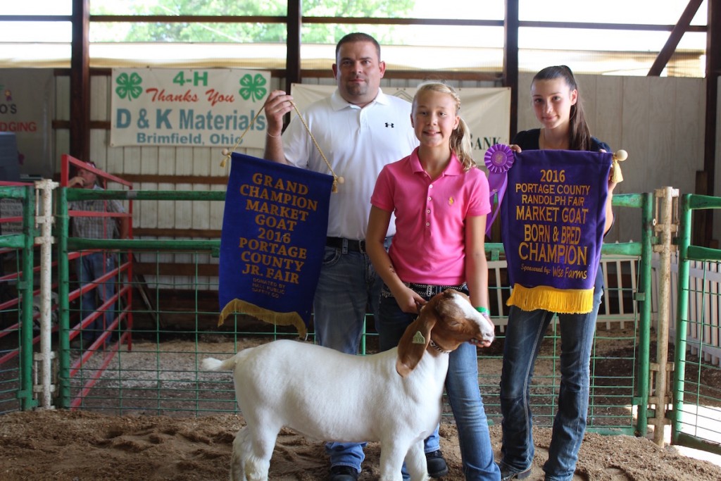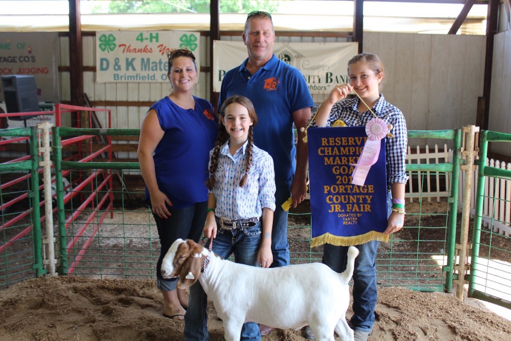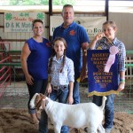 Sara Procaccio sold her 79-pound reserve champion goat for $1,200 to Whitney and Joe Wittensoldner, of Wittensoldner Realty. With them is Bella Procaccio (right).
