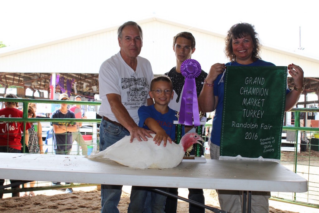 Lucas Ryan sold his 24.35-pound grand champion market turkey for $950 to Sabrina Christian-Bennett for commissioner (right). With them is Todd Smith (back center).