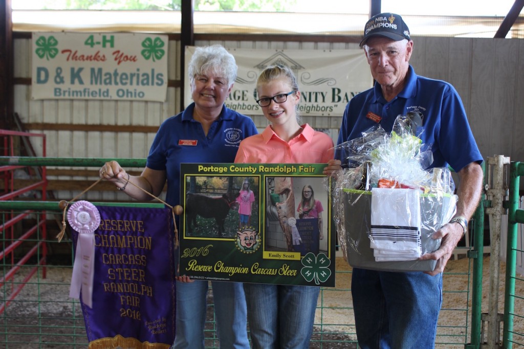 Emily Scott sold her 662-pound reserve champion carcass steer for $4.50 a pound to Tim and Diane Wise, representing Custom Laser.