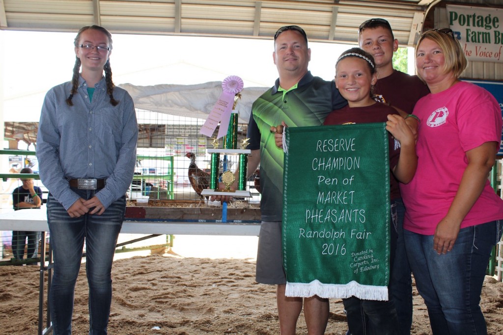 Amber Zavara (left) sold her 7.1-pound reserve champion pen of market pheasants for $650 to to Darrell and Angela Langford of Sunrise Springs Water Co. With them are children Mackenzie and Cameron Langford.