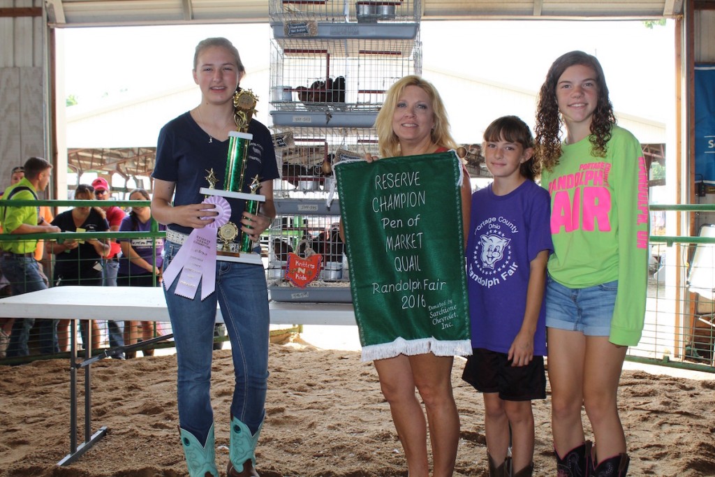 Autumn Richards (left) sold her 2.95-pound reserve champion quail for $650 to Denise Horning, and Julie and Kelly Rach, representing Ameriprise Financial and Horning Seasonal Storage.