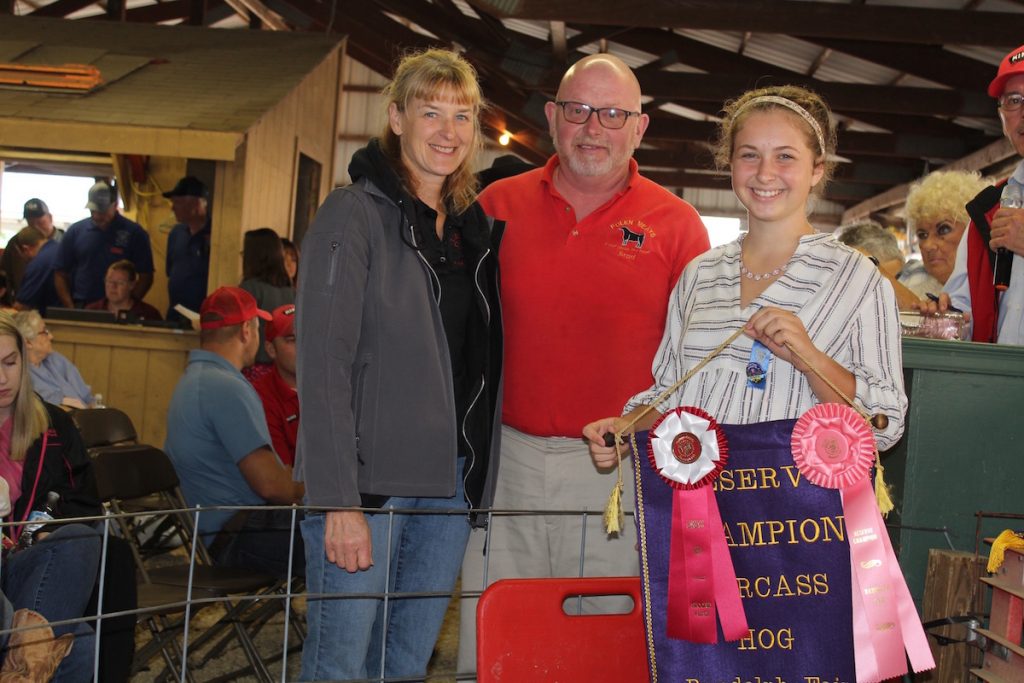 Bella Procaccio sold her 164-pound reserve champion carcass hog for $8 a pound to Brad and Nancy Polen, of Polen Meats.