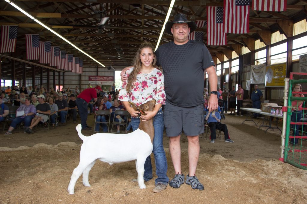 The Portage County Fair grand champion market goat, weighing 85 pounds, was shown by Taylor Hermann and purchased by Jason Hall of Hall Public Safety, for a new record of $3,000. rOriginal Caption:The Portage County Fair grand champion market goat, weighing 85 pounds, was shown by Taylor Hermann and purchased by Jason Hall of Hall Public Safety, for a new record of $3,000.