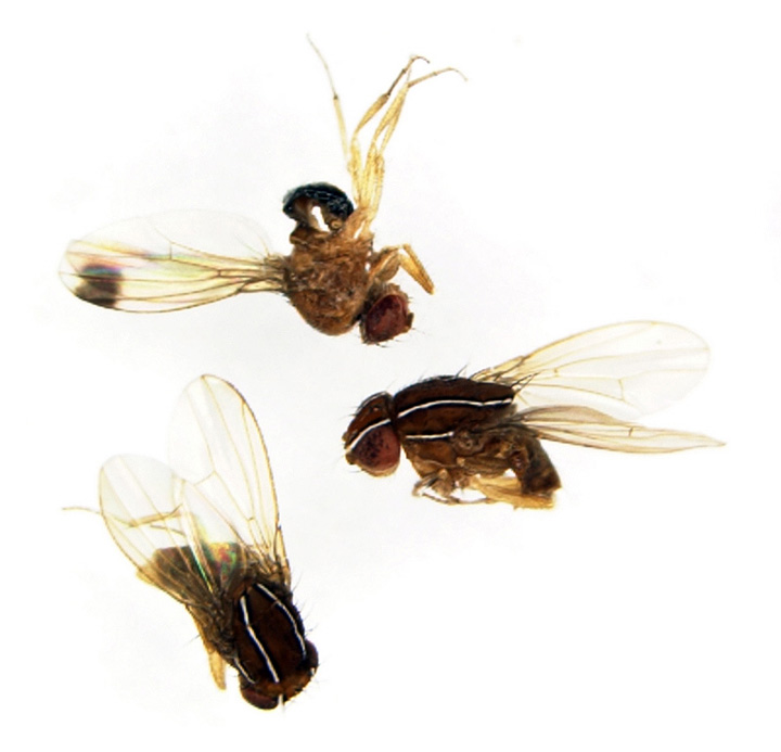 Adults of this species are slightly larger in size than the spotted wing drosophila and the background color of the body is lighter than most other drosophilid flies commonly found in vinegar monitoring traps.