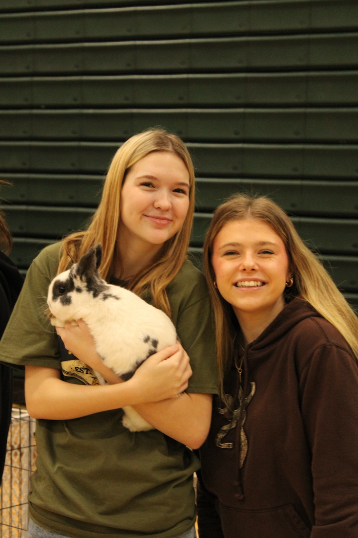Seniors Paige Hosler and Jordinn Heinemann hanging out with the class bunny Buckeye at Delta FFA’s annual eighth grade recruitment on Jan. 9, 2026. (Submitted photo)
