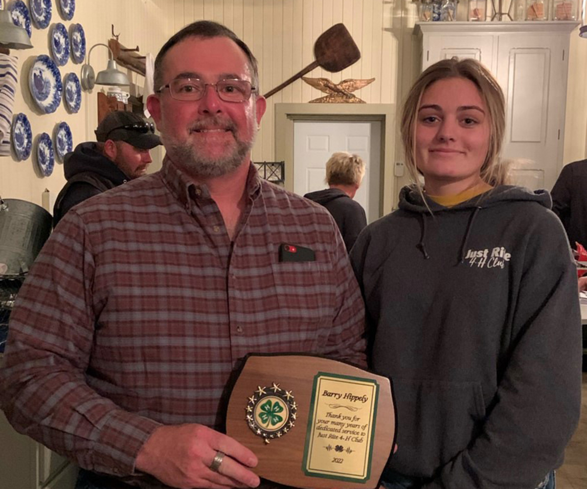 Just Rite 4-H — the oldest and largest club in Columbiana County — recently held their December meeting, welcoming nine new members. Nate Hall gave a presentation about junior leaders, and the club spent some time signing a few hundred Christmas cards to distribute to each resident at local nursing homes, including Blossom, Circle of Care and Oakhill Manor. Barry Hippely, who was the organizational leader for many years, was presented with a plaque for his years of dedicated service to the club. The club also held officer elections. New officers for the club include the following: Addy Blazer, president; Camryn Cody, vice president; Marin Stryffeler, treasurer; and Grace Knight; secretary. Pictured is club president Camryn Cody (right) presenting Barry Hippely with a plaque for his many years of dedicated service.