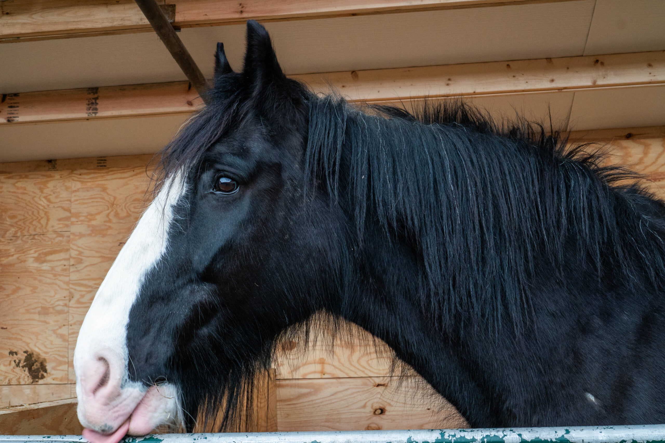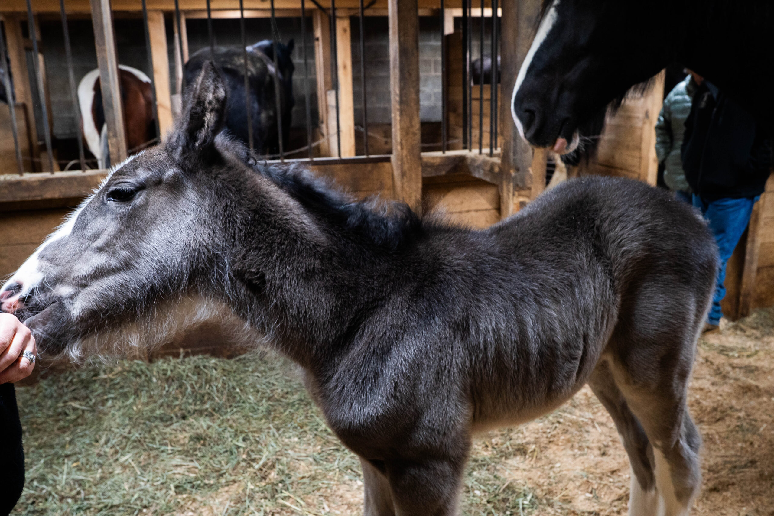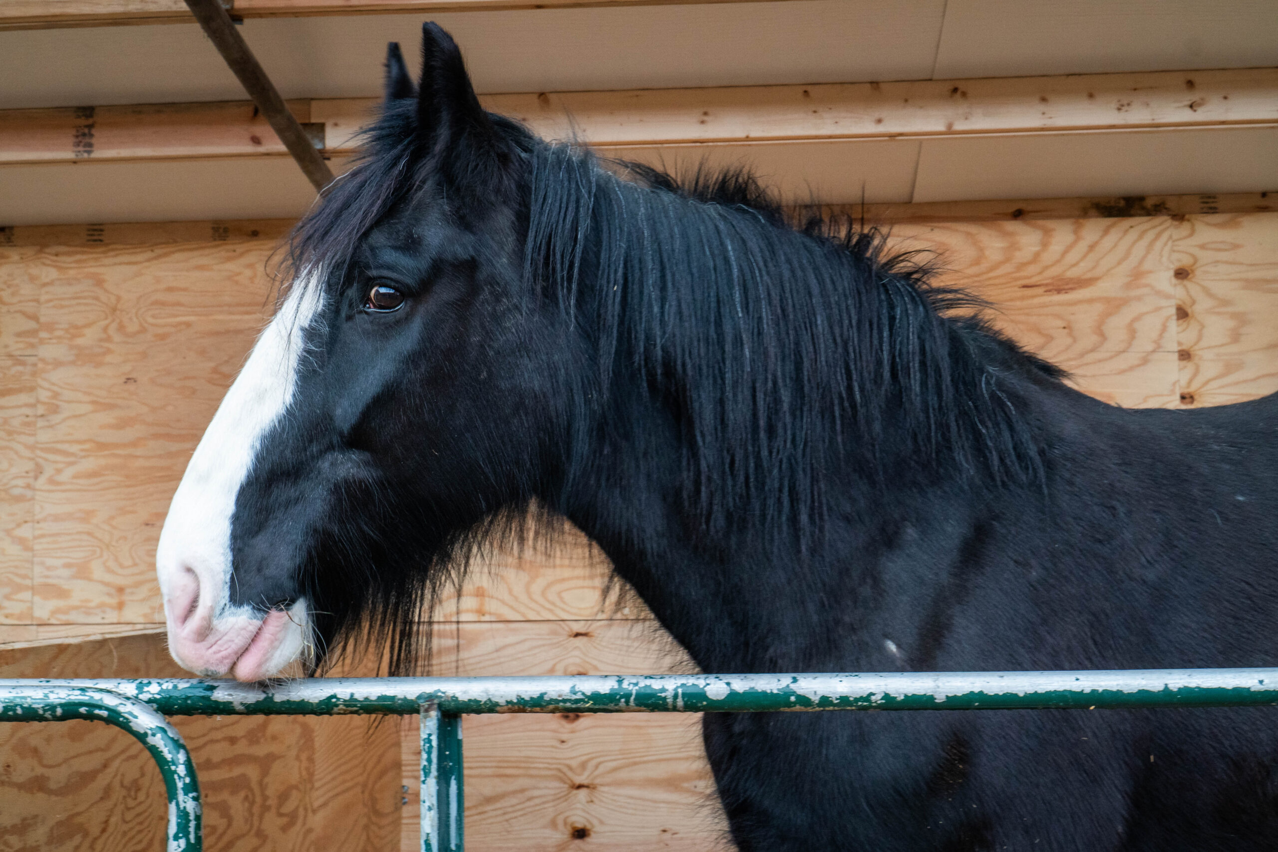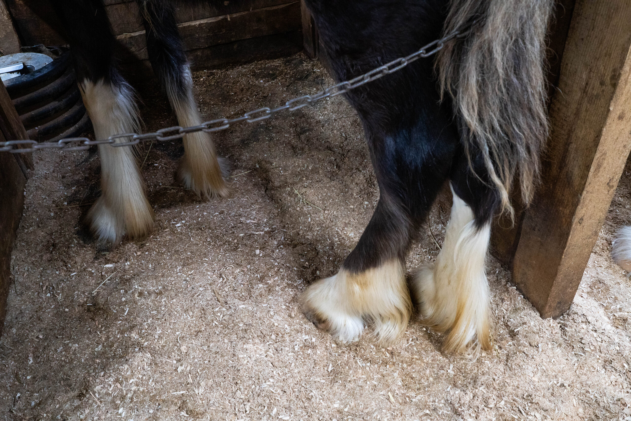 Shires originate from England. According to the Greenlees, this horse would clean out the bogs, walking through sharp grass that would cut their legs and lead to infections. To solve this problem, shires were bred to have long hair on their legs to protect them from these working conditions; today, these long hairs are called “feathers.”