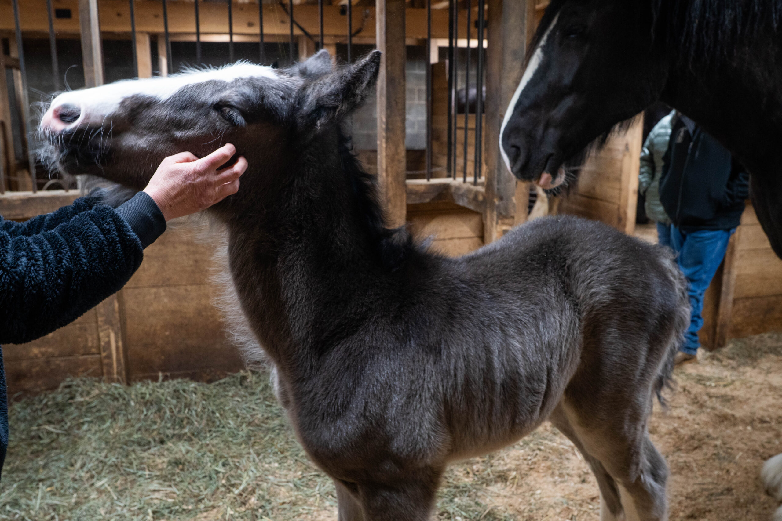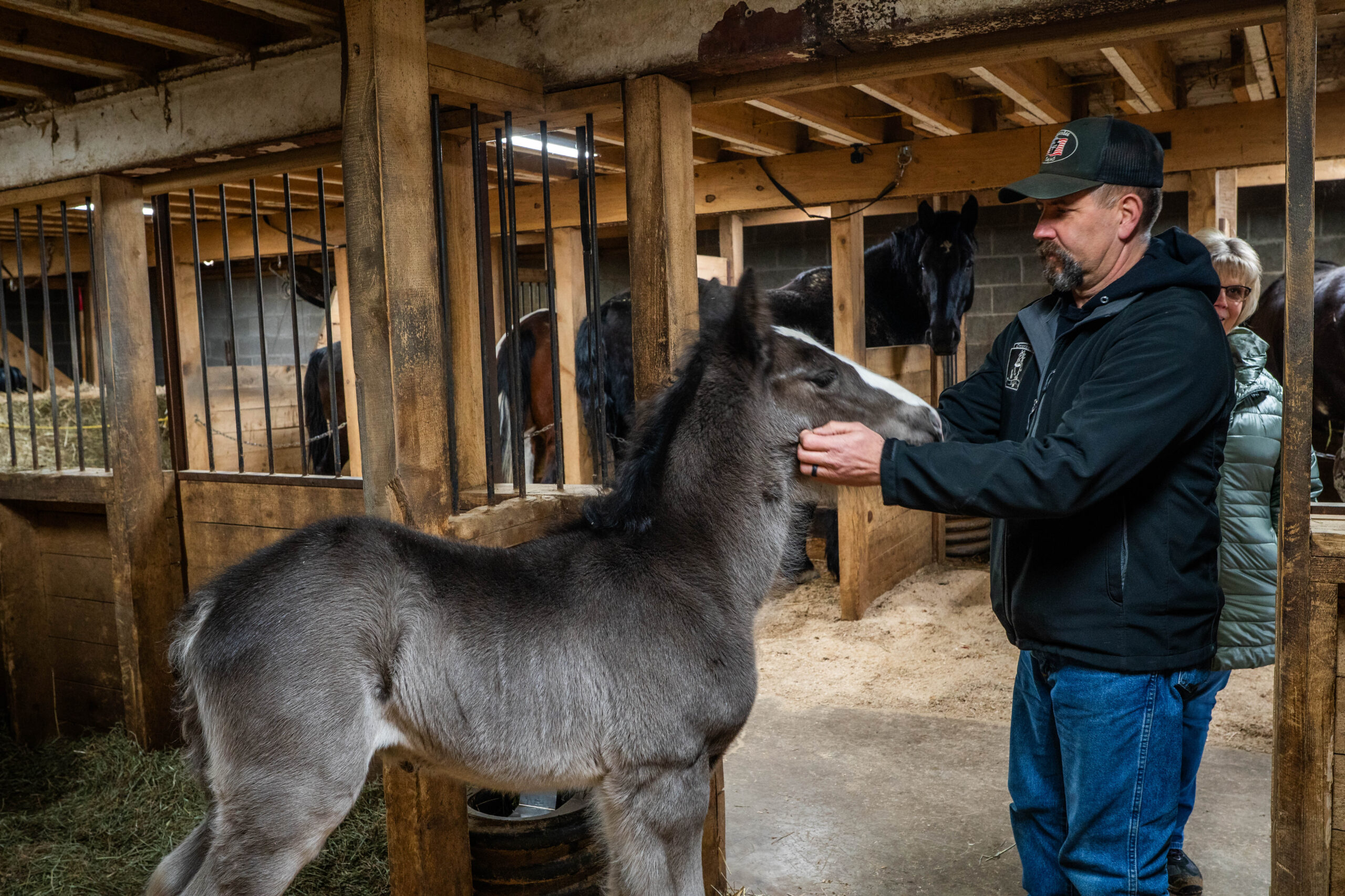 Tom Greenlee pets his first shire horse Ellie while Lisa Greenlee watches on Feb. 24, 2026. (Liz Partsch photo)