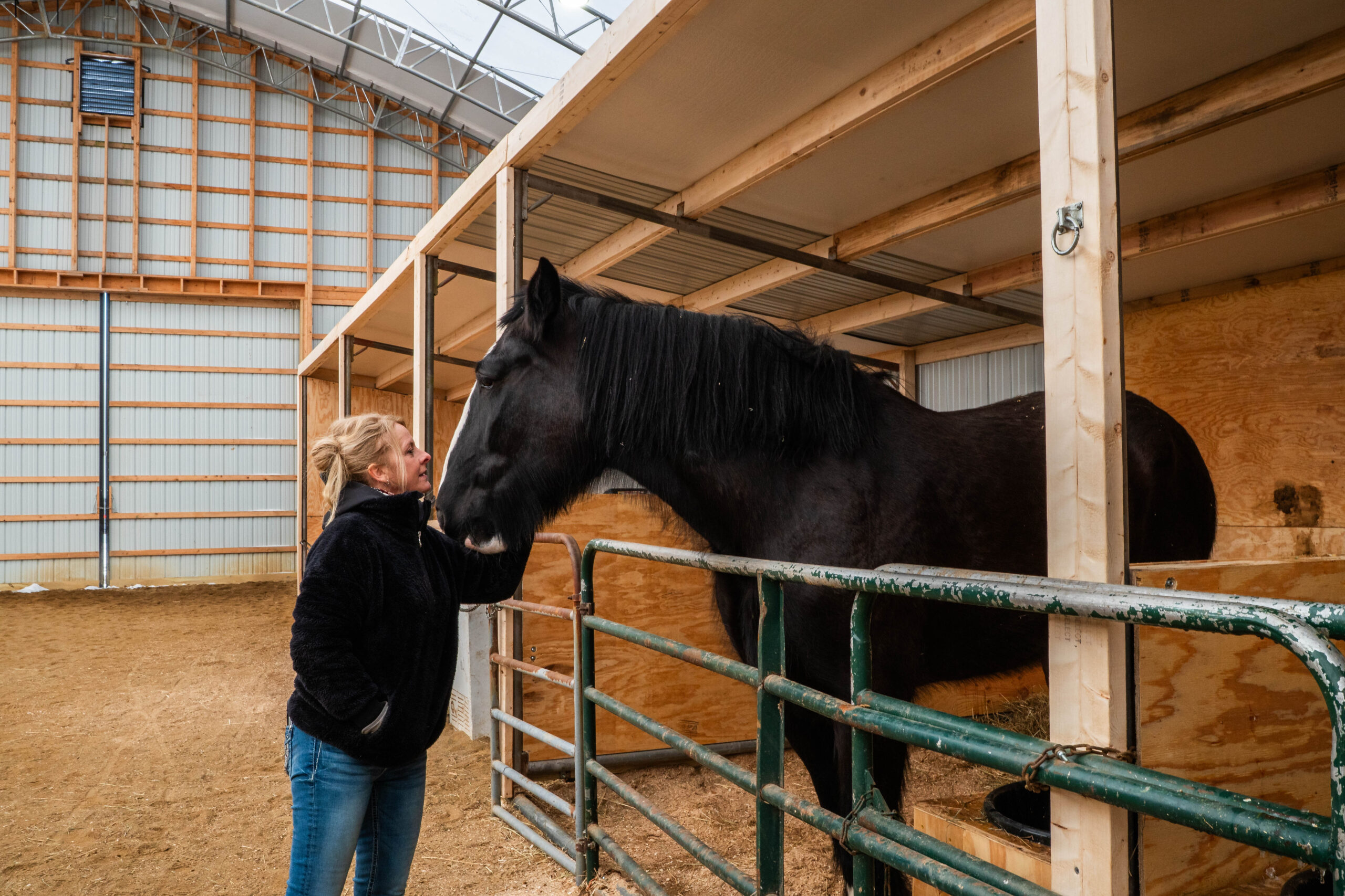 Tom and Lisa Greenlee pet Ellie, Tom's first shire horse, in the arena at Greenlee Farms in Utica, Pennsylvania on Feb. 24, 2026. (Liz Partsch photo)