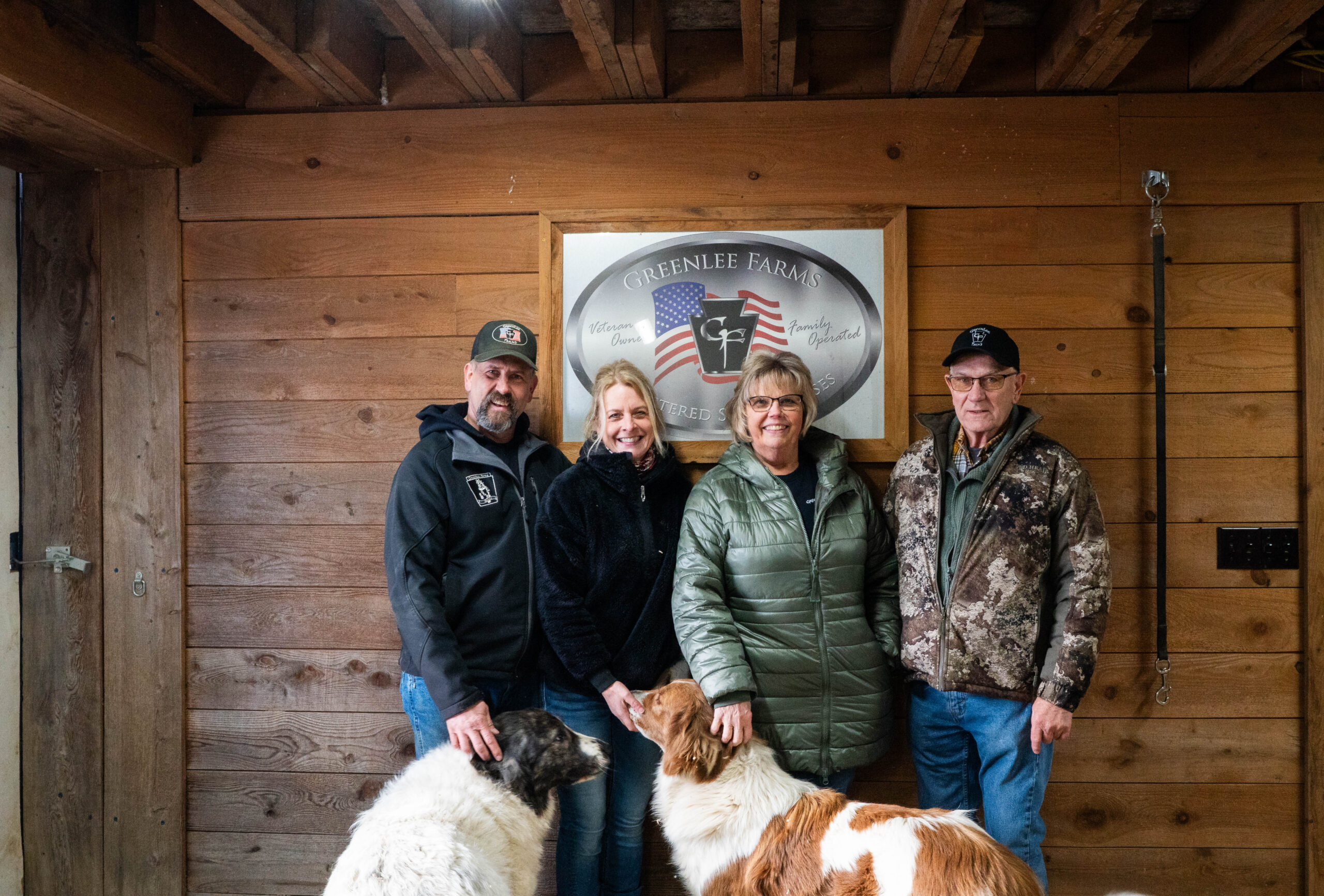 (From left to right) Tom, Lisa, Pam and Tom Greenlee stand in front of a Greenlee Farms sign in the barn at Greenlee Farm in Utica, Pennsylvania on Feb. 24, 2026. (Liz Partsch photo)