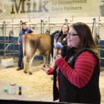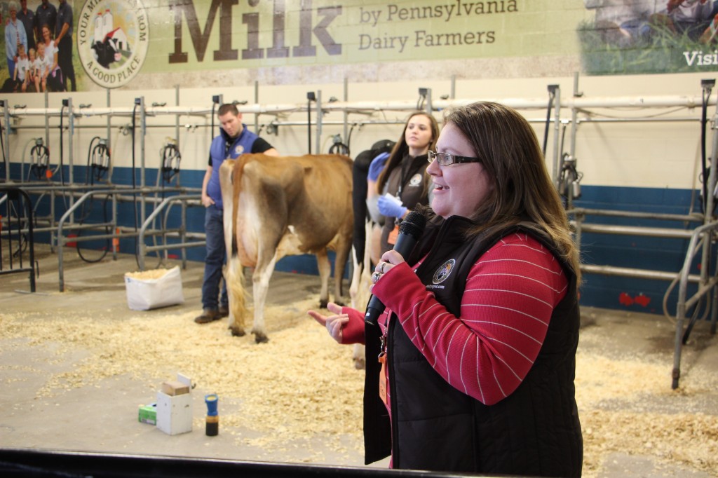 Erica Mowrer of Mowrer Farms in Huntingdon County works with the Pennsylvania State Extension Dairy Team to show visitors how cows are milked.15
