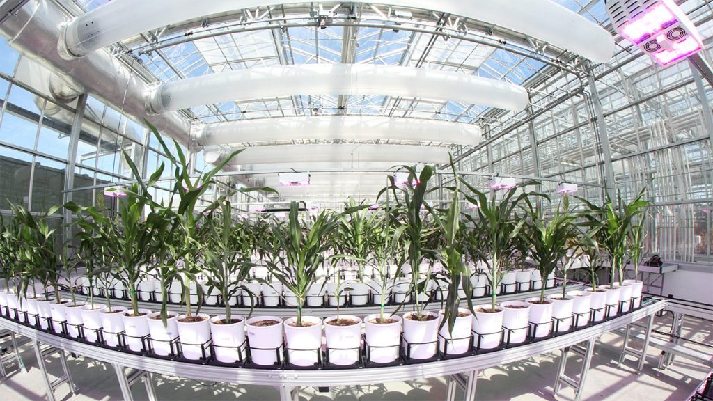 Compare the sensor data against a known quantity — in this case, finely calibrated technology at Nebraska’s Greenhouse Innovation Center. There, a series of conveyor belts, hyperspectral cameras and scales can detect faint changes in the water weight of individual plants that either do or don’t sport the new sensors.