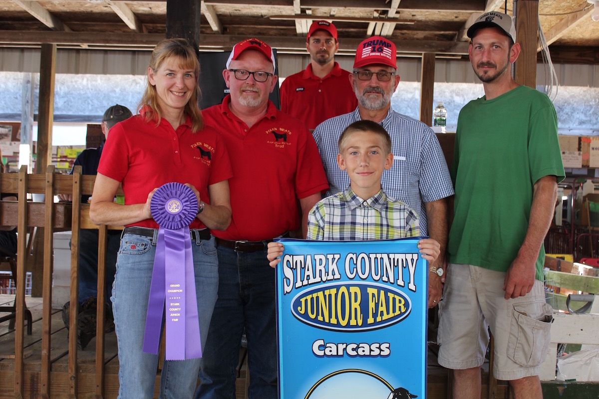 Jonathan Shoemaker sold his 110-pound champion carcass lamb for $8 a pound to Nancy and Brad Polen (left), of Polen Meats; and Ron and Steve Kiko, of Kiko Meats.