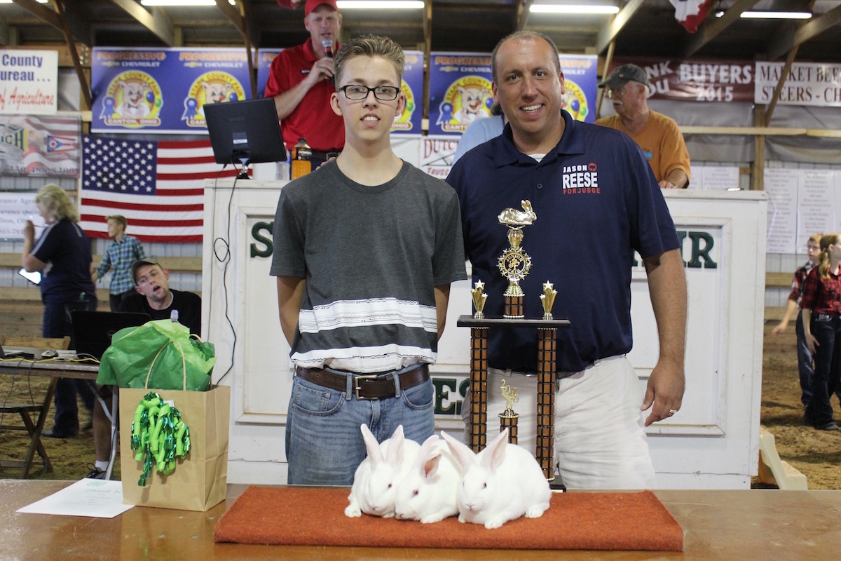Christian Pernell sold his champion pen of meat rabbits for $500 to Jason Reese for Stark County family court judge.