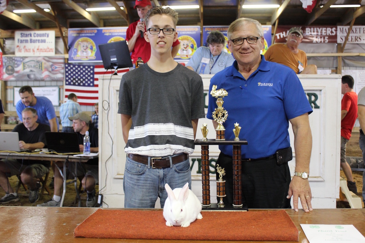 Christian Pernell sold his reserve champion rabbit fryer for $325 to to Tom Stocksdale of Farmers National Bank.