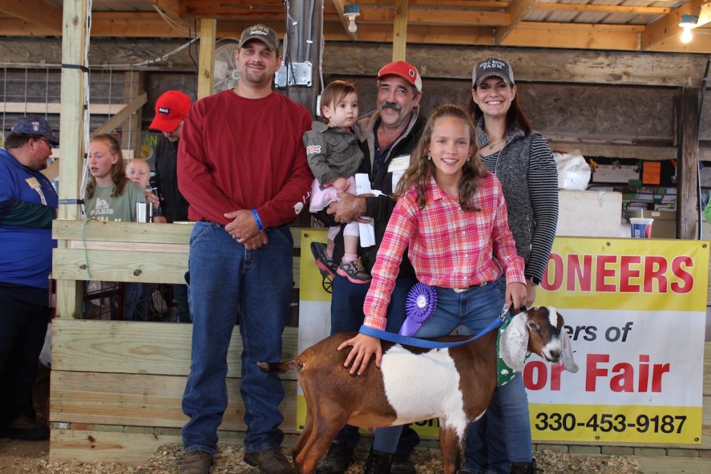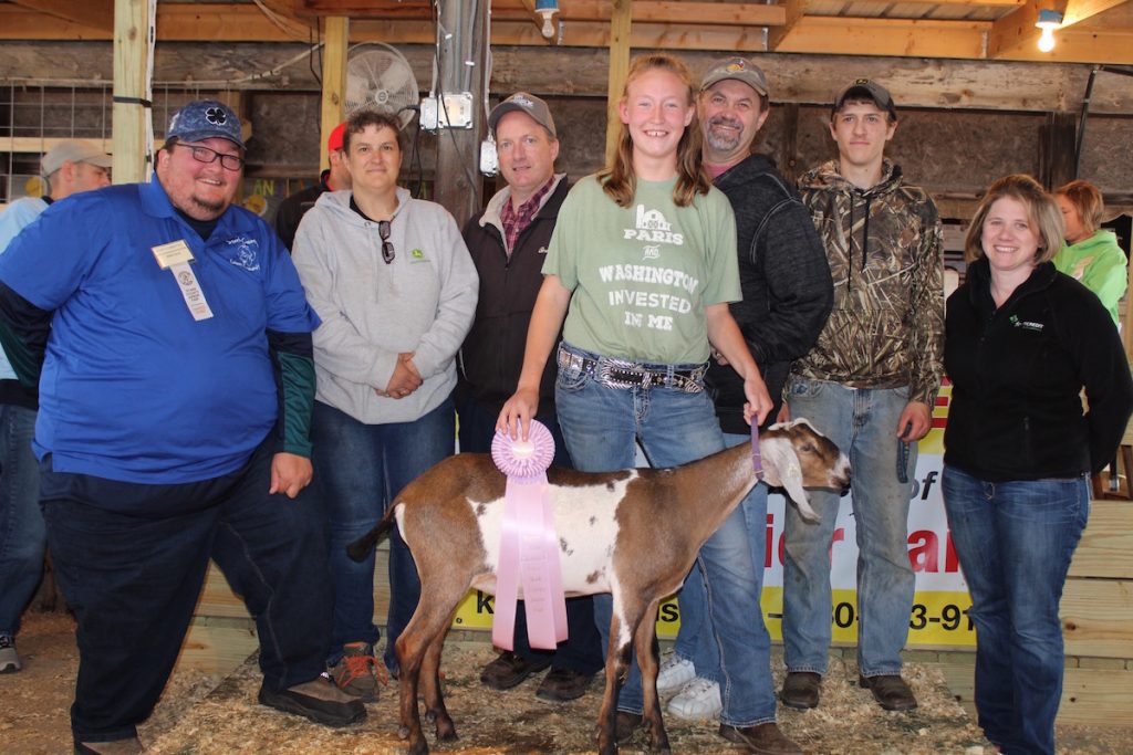 Maranda Neff sold her 85-pound reserve champion dairy goat for $12 a pound to Clearview Farms; Faverty, Ken & Fran; Ken Faverty,JR.; Kalleker Drywall; T & J Lawncare; Carrie's Meadow Dairy Goats; Wallace Farms Feed Drive Thru; Sugardale Foods; Farm Credit Mid-America; Paris and Washington Insurance.