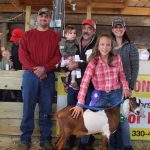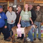 Cayla Raber sold her 68-pound champion dairy goat for $12 a pound to Cory Smith for Sarchione Chevy/Ford of Randolph, Joe Ramsey of Ramsey Hoof Trimming, and Crisiva Varner of Still Water Farm.