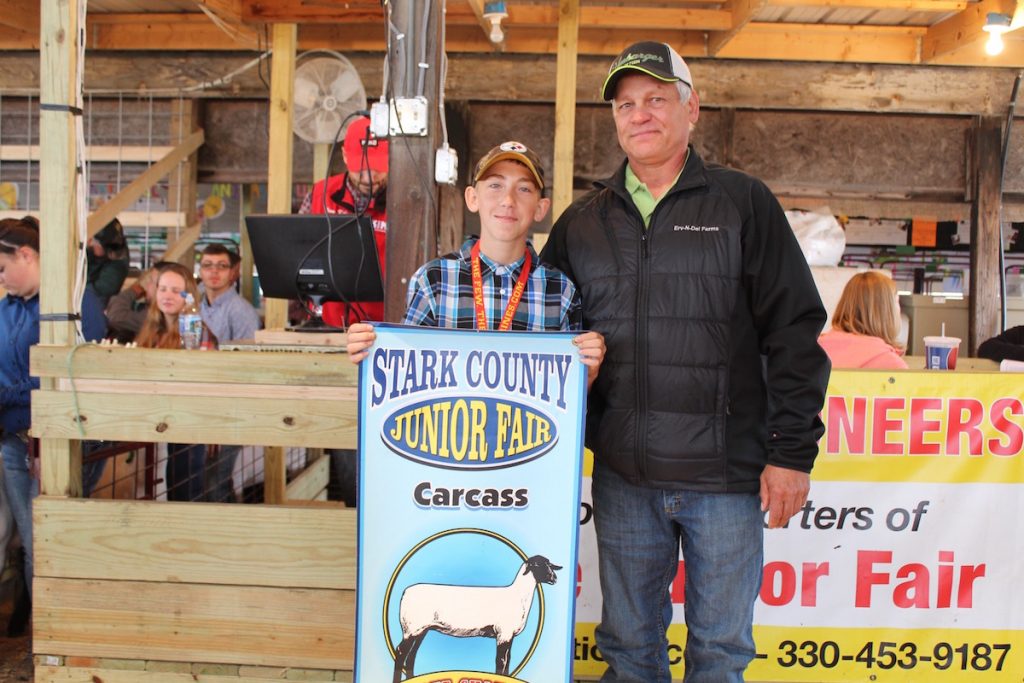 Johnathan Shoemaker sold his 119-pound reserve champion carcass lamb for $8 a pound to Cliff Linder of Umbarger Feeds.