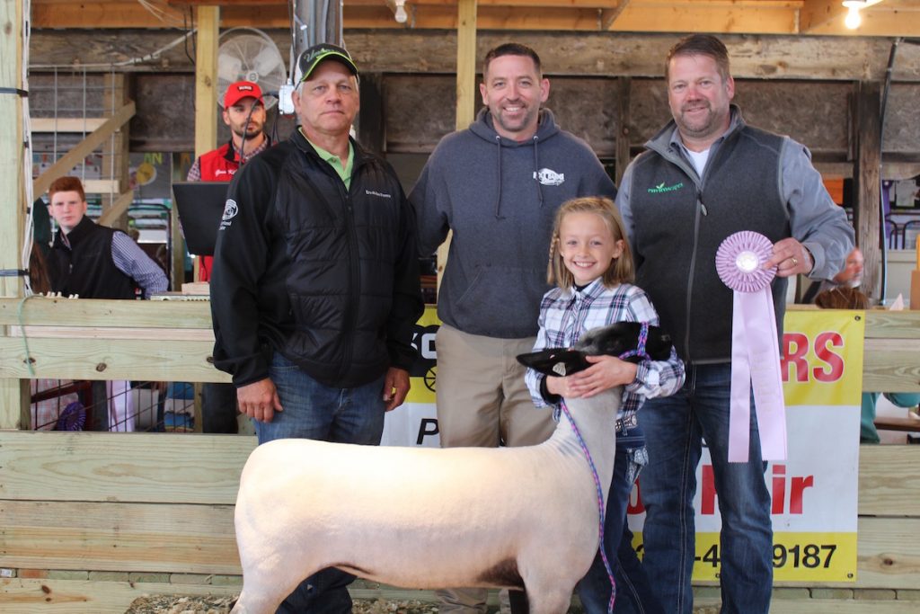 Hailey Chenevey sold her 139.60-pound reserve champion lamb for $10.50 a pound to Cliff Linder of Umbarger Feeds, Reggie Stoltzfus of Poll Barns Direct, and Todd Pugh of Enviroscapes.