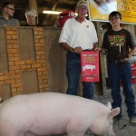 Corey Soulek (right) sold his 285-pound grand champion market hog for a record $9.50 a pound to Andrea Rykalla and Maxx Marhofer, representing Ron Marhofer Auto.