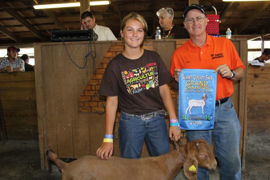 Jordan Sedensky sold her 100-pound grand champion market goat for a record $500 to Dale Leppo of Leppo Rents.