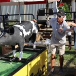Hailey Bode, 6, of Wooster, tries her best to lasso a hog for a chance to win a free hat, Aug. 1 at the Summit County Fair. Chris Weaver, of the Tractor Supply and Cub Cadet display, gives her some helpful coaching.